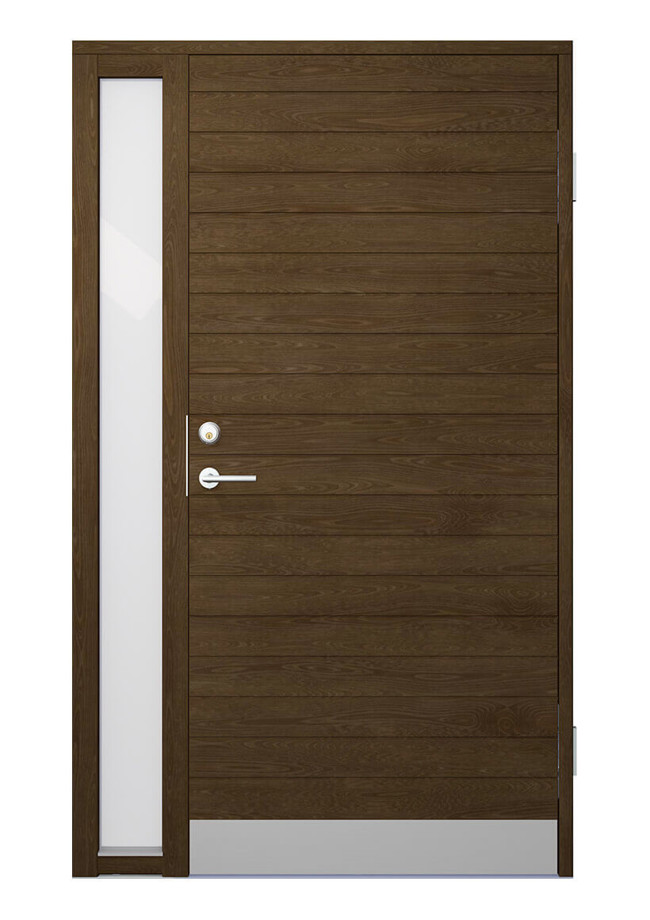 Ytterdörren Sjö med sidoljus är en exklusiv ekdörr med integrerat sidoljus och ger dig en ljusare hall. Dörren får sin vackra färg från en naturlig process där trät röks och grundoljas. Därför får varje dörr en unik färgkombination. Välj mellan nyanserna Cappucino och Espresso.