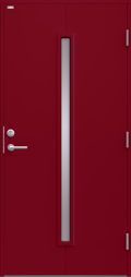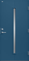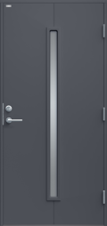 Ytterdörr i modern stil med sparsmakad dekor och smalt, stående klarglas.